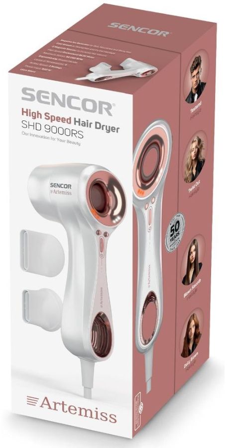 Vlasy jako koruna krásy. Spousta žen se tímto heslem řídí a svým vlasům dopřává tu nejlepší péči. Ta začíná u výběru vhodných přípravků a končí u stylingu, jehož součástí je i fénování. Výběr fénu si proto zaslouží dostatek pozornosti. Stejně jako designový fén na vlasy Sencor SHD 9000RS Artemiss s BLDC vysokorychlostním digitálním motorem. Díky této revoluční technologii má delší životnost a větší výkon. Silná ionizace zároveň zaručí, že vlasy budou stále jemné, vyživené a lesklé. Fénovat lze se 2 magnetickými nástavci, které se dají snadno vyměnit. Díky kompaktnímu rozměru je vhodný na cestování, ale i jako fén do domácnosti.