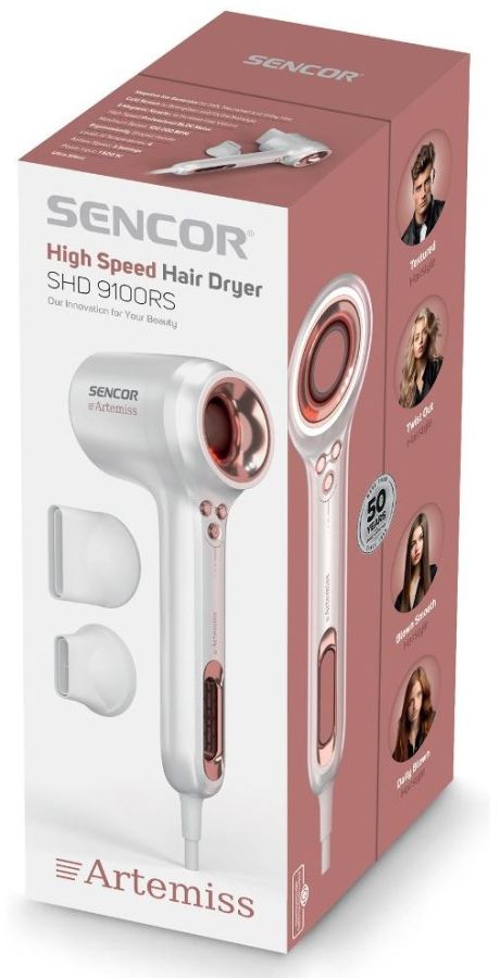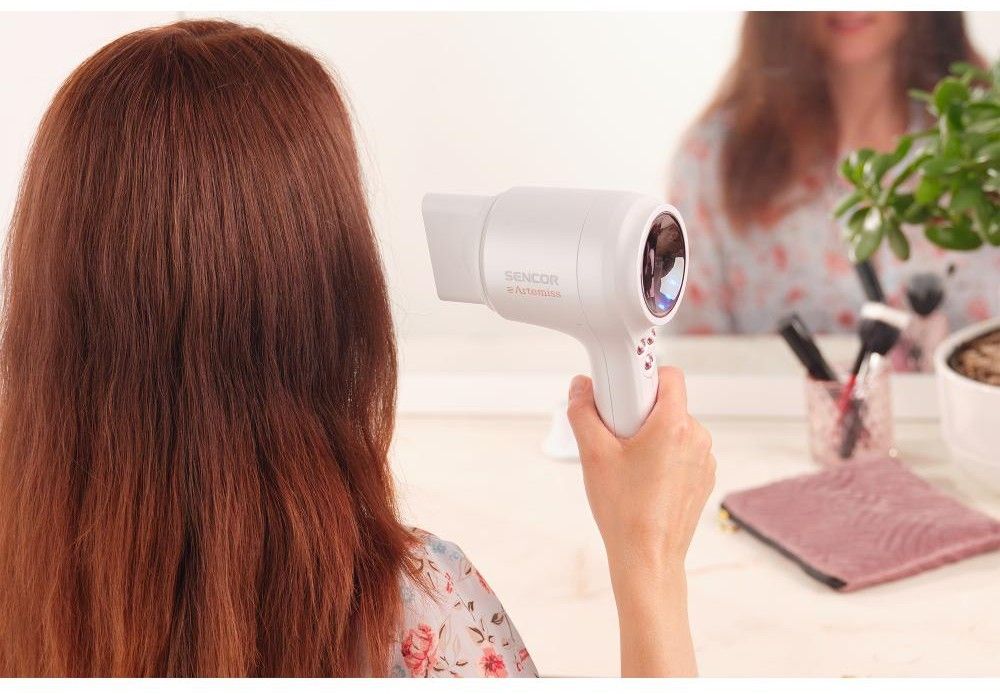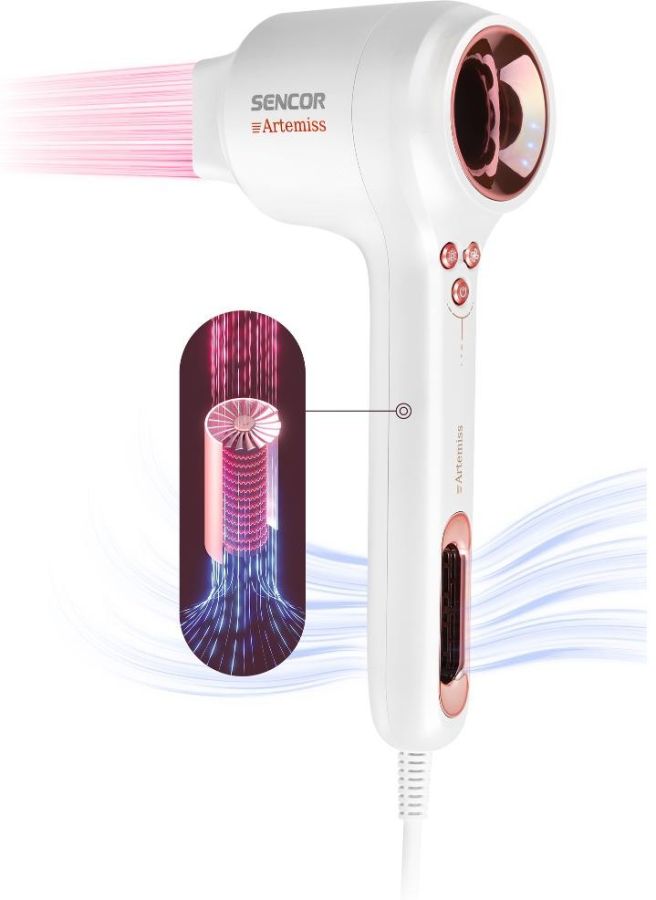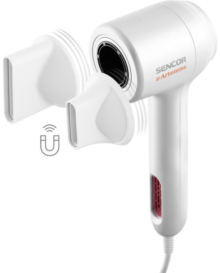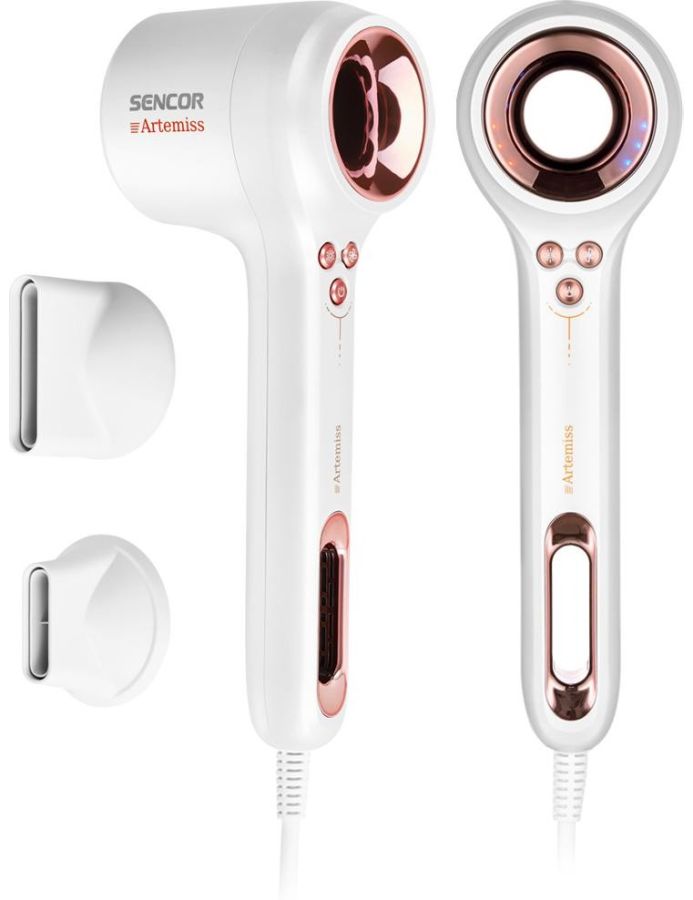 Vlasy jako koruna krásy. Spousta žen se tímto heslem řídí a svým vlasům dopřává tu nejlepší péči. Ta začíná u výběru vhodných přípravků a končí u stylingu, jehož součástí je i fénování. Výběr fénu si proto zaslouží dostatek pozornosti. Stejně jako designový fén na vlasy Sencor SHD 9100RS Artemiss s BLDC vysokorychlostním digitálním motorem. Díky této revoluční technologii má delší životnost a větší výkon. Silná ionizace zároveň zaručí, že vlasy budou stále jemné, vyživené a lesklé. Fénovat lze se 2 magnetickými nástavci, které se dají snadno vyměnit.