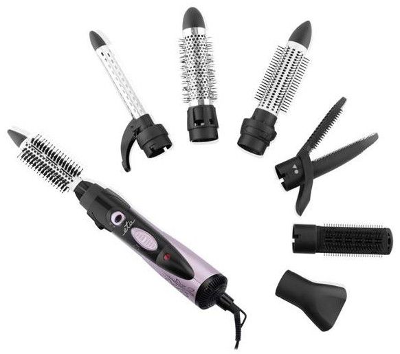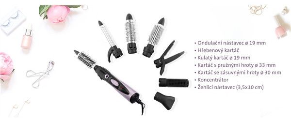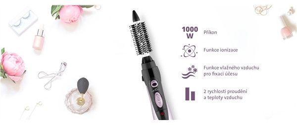 Horkovzdušná kulma disponuje 7 tvarovacími kartáči, 2 rychlostmi a teplotními stupni i tlačítkem rychlého ochlazení pro fixaci účesu.
