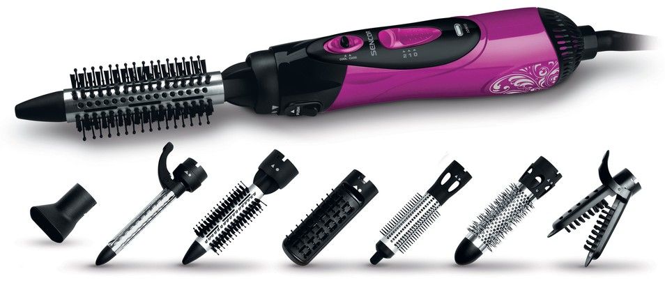 Horkovzdušná kulma se 2 teplotními stupni a 7 výměnnými nástavci.