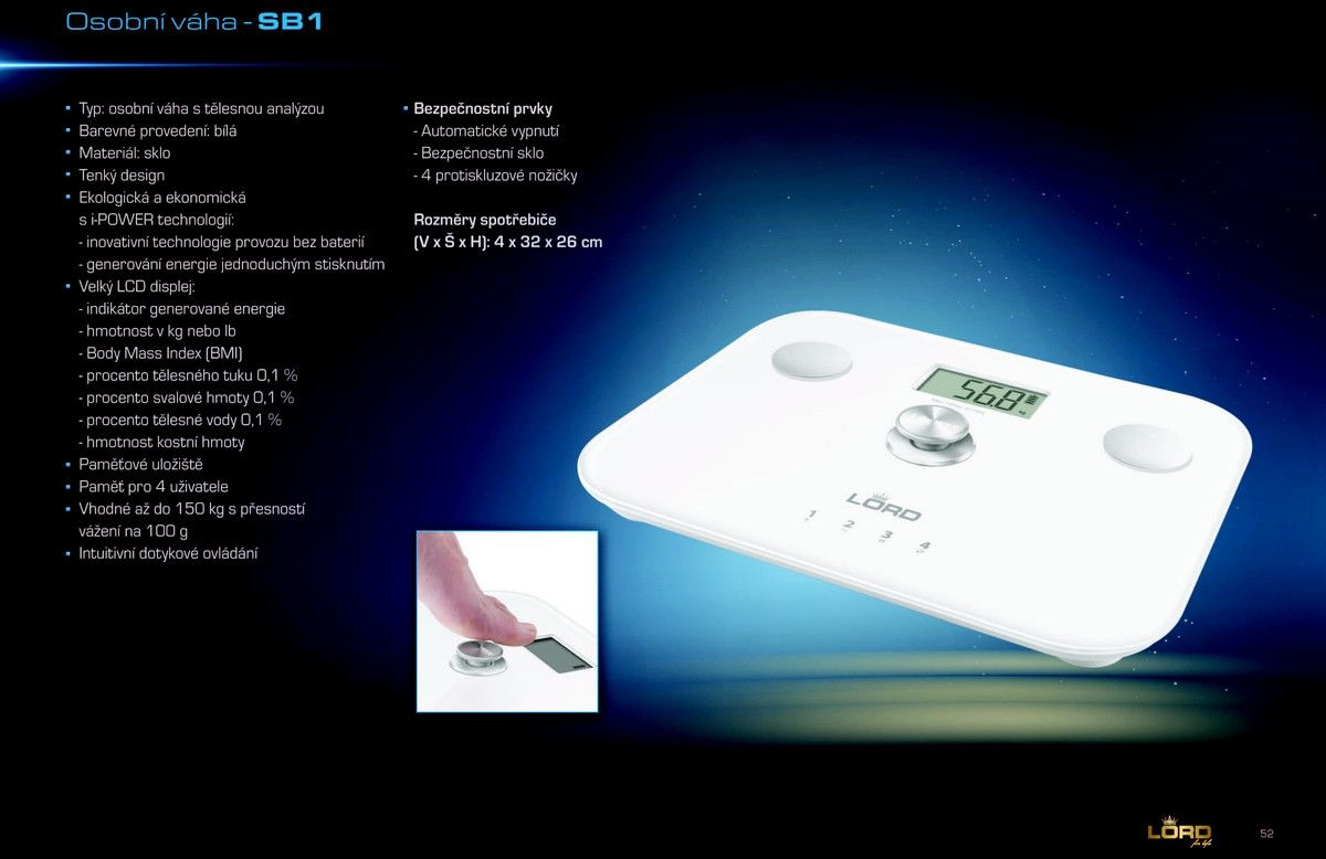 Osobní váha s tělesnou analýzou vhodná až do 150 kg. Je ekologická a ekonomická s i-POWER technologií. Má velký LCD displej.