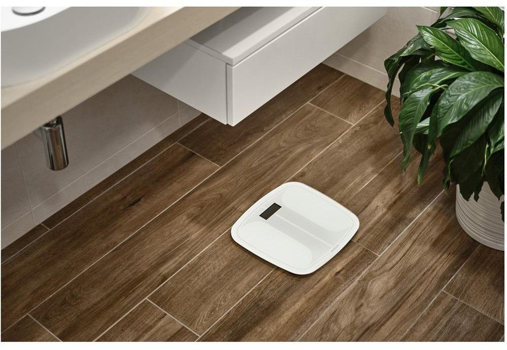 Atraktivní vzhled osobní váhy v bílém provedení je obohacen o geometrické jemné ornamenty na horní desce, které vás směrují kam položit přesně plosky nohou. Přehledný LCD displej je podsvícený LED diodami. Poskytne vám přesné informace o aktuální váze a měrných jednotkách.