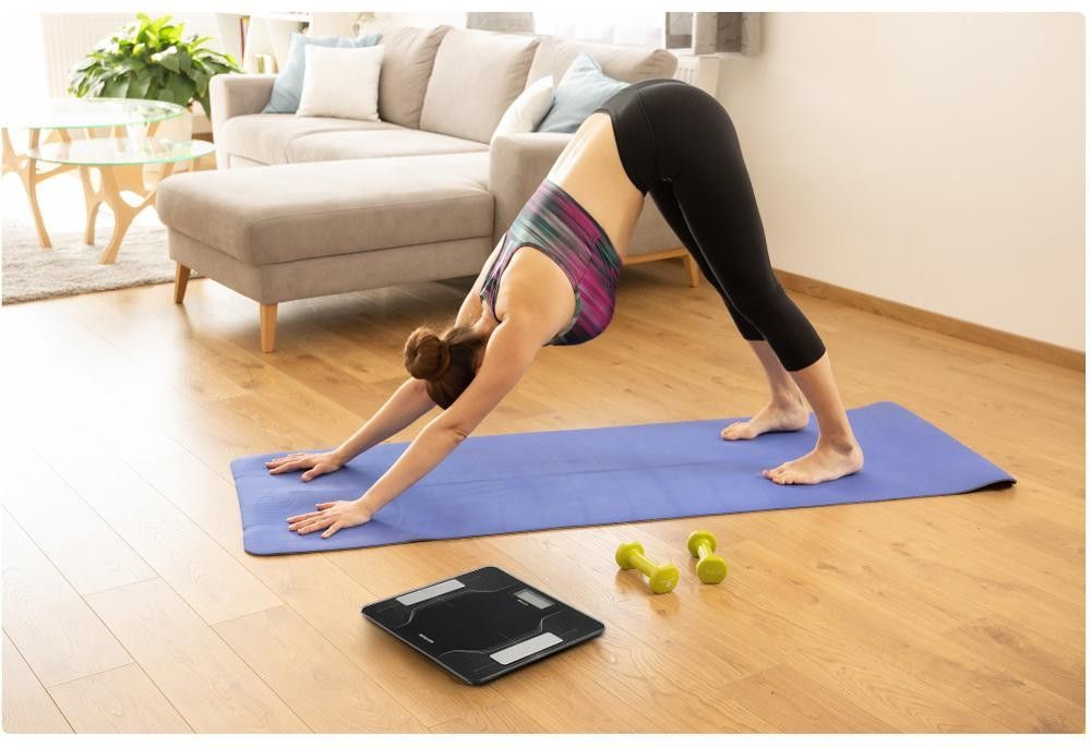 - Počítá BMI, % tuku, % vody, % svalů, % kostí
