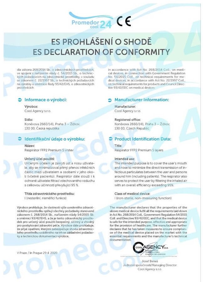 Pětivrstvá ochrana splňuje kritéria třídy FFP2 a účinnost filtrace je nejméně 95 %. Jedná se o zdravotnický prostředek dle směrnice 93/42/EHS a současně o osobní ochranný prostředek dle nařízení 2016/425. Jednorázové použití.