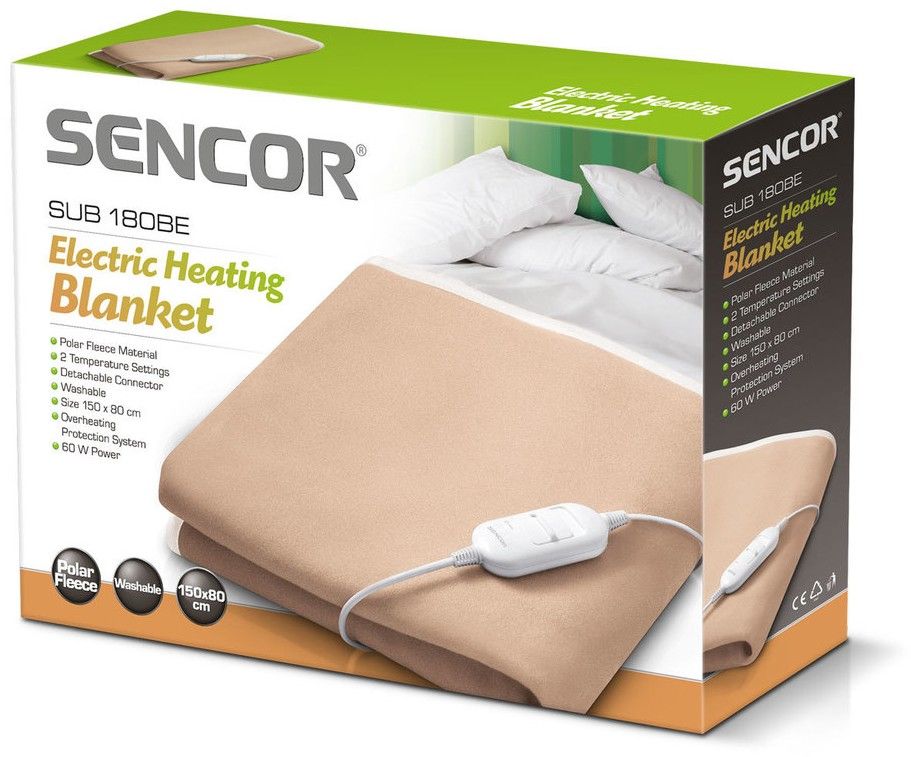 Vyhřívací deka SENCOR SUB 181BE o rozměru 150x80 cm je určena na jednu postel. Je vyrobena ze 100% polyesteru (Polar Fleece). Tento na omak velmi příjemný materiál již sám o sobě slibuje vysokou hřejivost. Jakmile zapnete vyhřívání, rozsvítí se kontrolka zapnutí. Intenzitu vyhřívání si volíte 2 stupni nastavení teploty na dálkovém ovladači. Deka má ochranu proti přehřátí. Po odejmutí kabelu s ovladačem je možné ji prát.