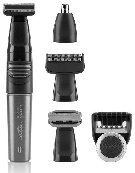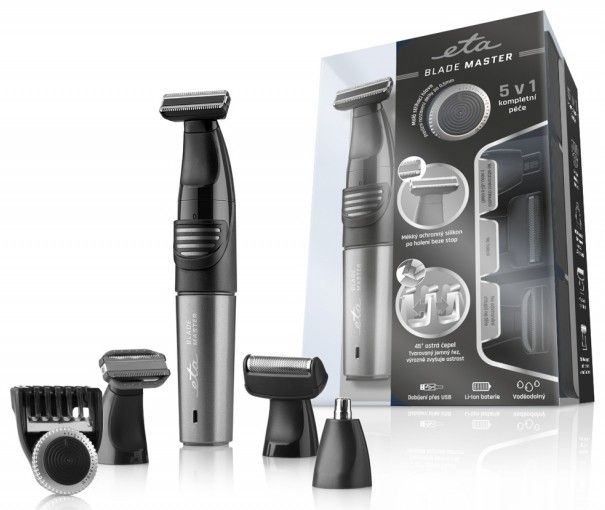 Výměna příslušenství je rychlá a snadná. V balení naleznete 5 různých nástavců na všechny části těla. Díky 3,2V Li-ion baterii bude ETA Blade Master v provozu až 60 minut a plně nabitý je už za 2 hodiny. O stavu nabíjení i provozu vás bude informovat světelná kontrolka. Nabíjení probíhá chytře skrze USB kabel, který je součástí balení.
