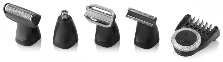 Díky několika vyměnitelným nástavcům a ostrým nerezovým břitům jej můžete využít na holení i úpravu vousů, zastřihnutí vlasů, chloupků na těle a úpravu chloupků v nose i uších. Jednoduše 5 v 1.