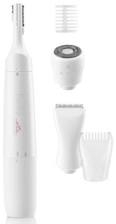 Dámský zastřihovač chloupků má frézkový nástavec, nástavec na úpravu obočí, univerzální nástavec na odstraňování chloupků na těle a ochranné plastové krytky na nástavce. Výdrž akumulátoru až 50 minut.