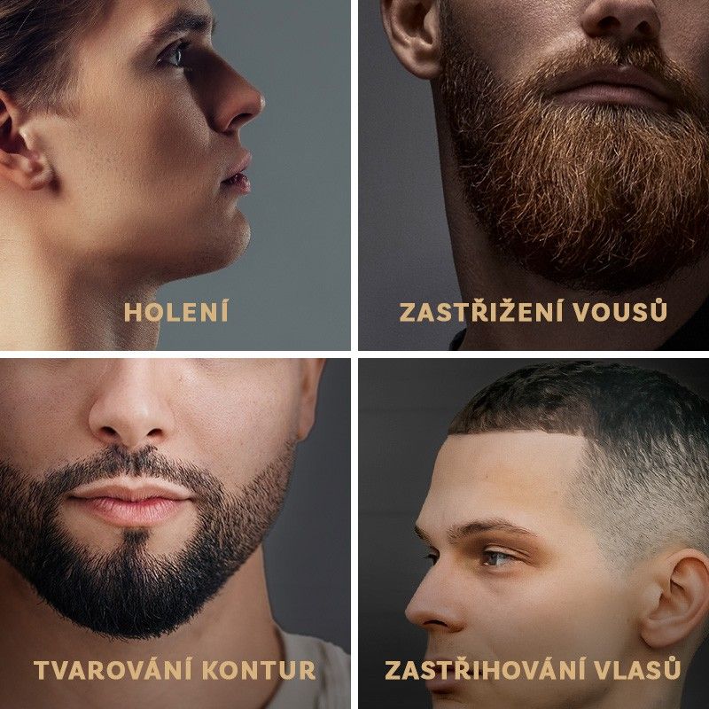 Zastřihovač vlasů a vousů s titanovo-keramickým ostřím, 6 vyměnitelnými hřebenovými nástavci, maximální dobou provozu cca 60 min a dobou nabíjení 2,5 hodiny.