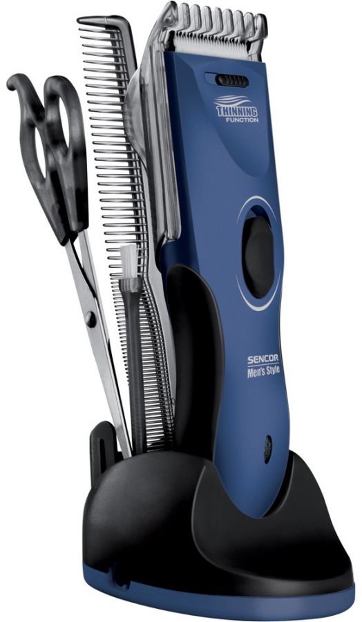 - nabíjecí základna s držákem příslušenství, dobíjecí/napájecí adaptér, 2 hřebenové nástavce, hřeben, nůžky, čistící kartáček, olej do stříhací jednotky