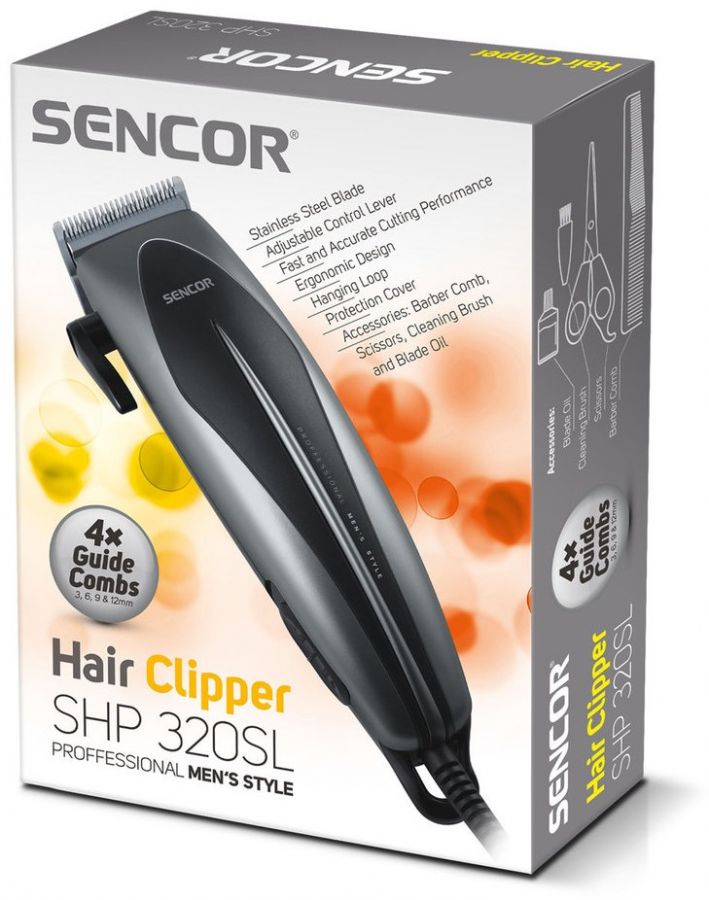 Zastřihovač vlasů s nerezovým břitem, který nepodléhá korozi, 4 hřebenovými nástavci a páčkou pro nastavení délky střihu.