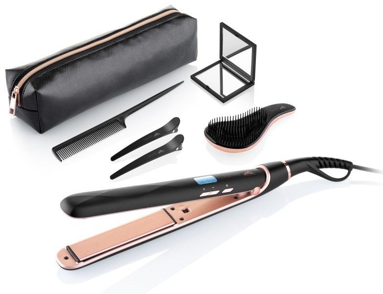 Žehlička na vlasy s odpruženými destičkami v dárkovém balení v praktické taštičce doplněná kartáčem na vlasy, hřebenem, klipy a zrcátkem.
