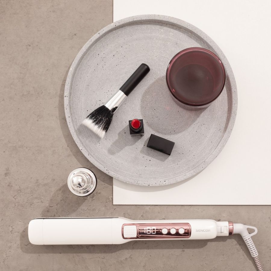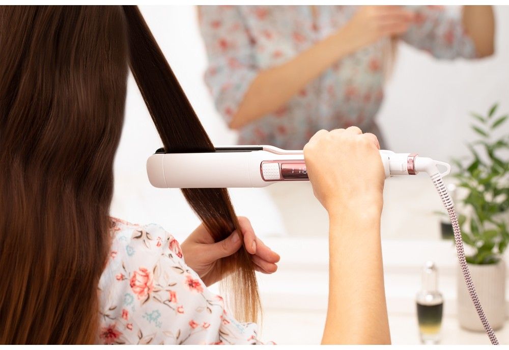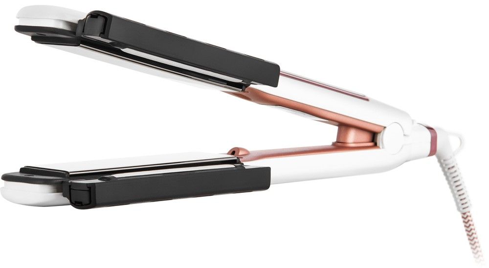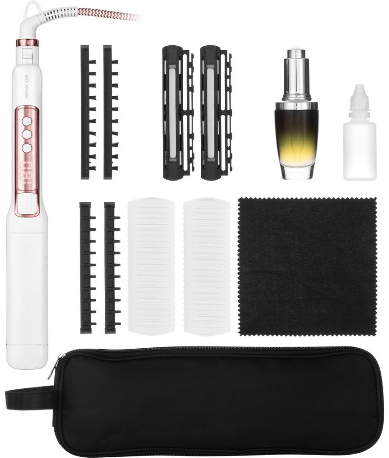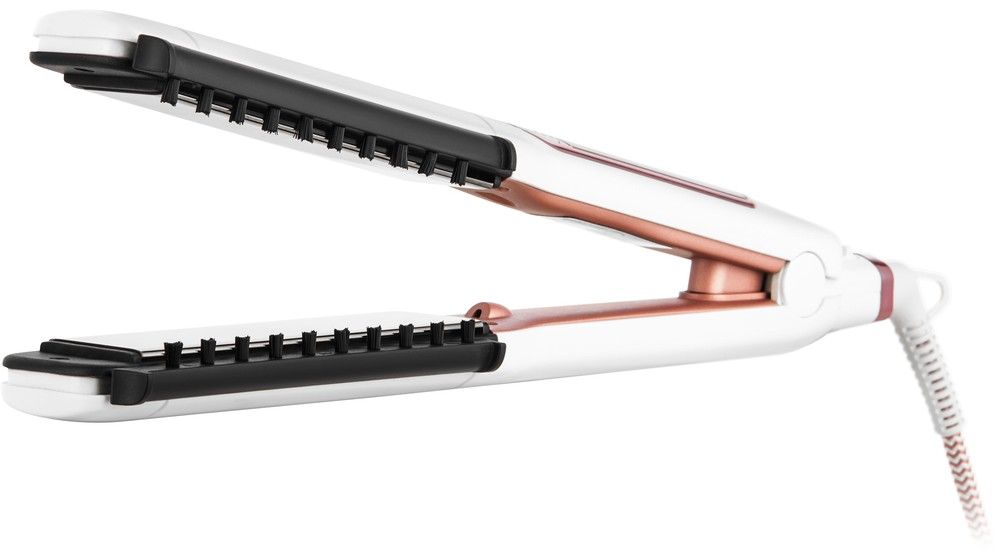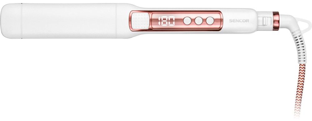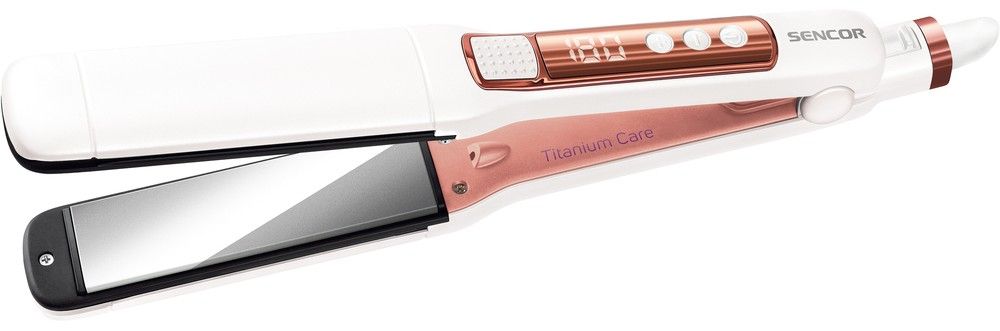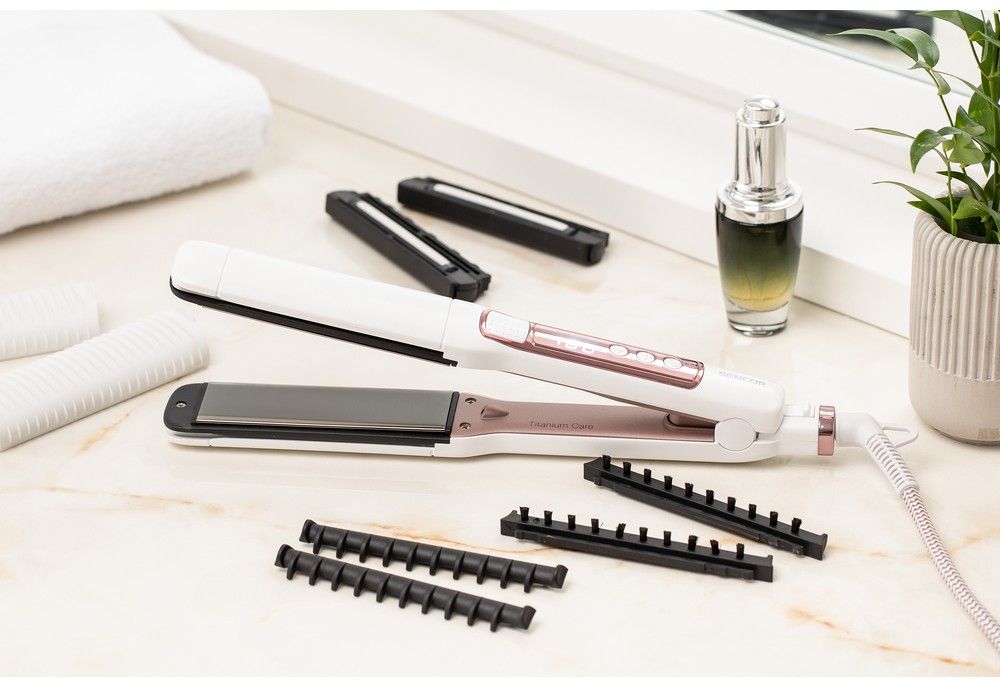 Žehlička na vlasy je vybavena titanovými destičkami, 3 různými nástavci, max. teplotou do 230°C a otočným kabelem s délkou 180 cm