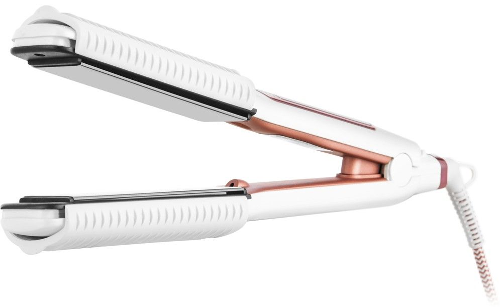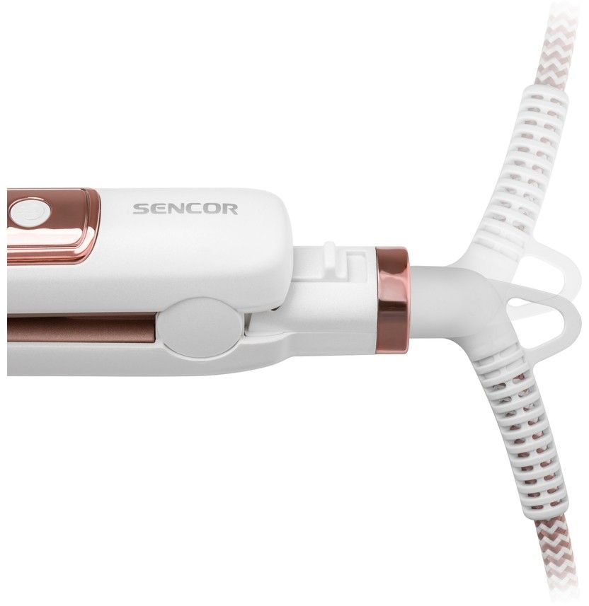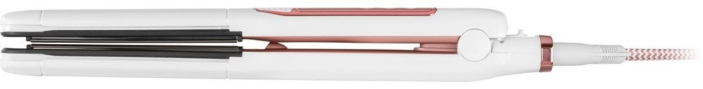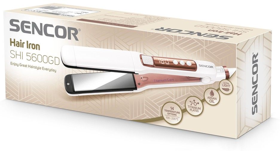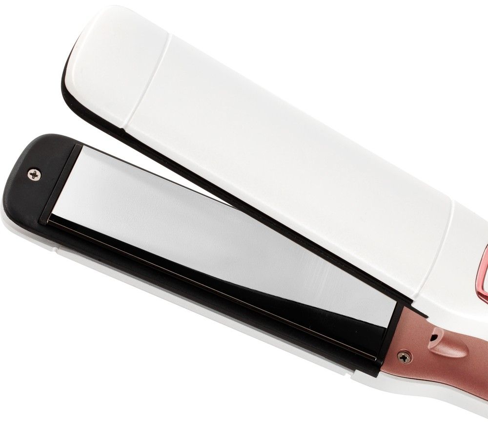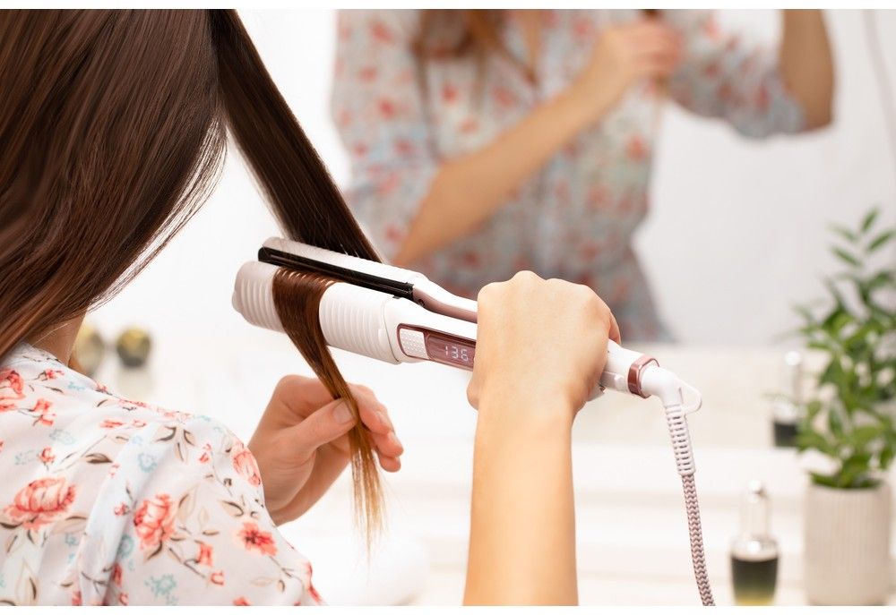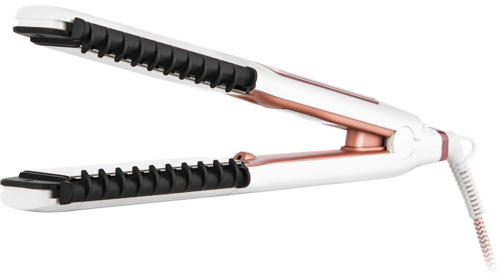 Žehlička na vlasy je vybavena titanovými destičkami, 3 různými nástavci, max. teplotou do 230°C a otočným kabelem s délkou 180 cm