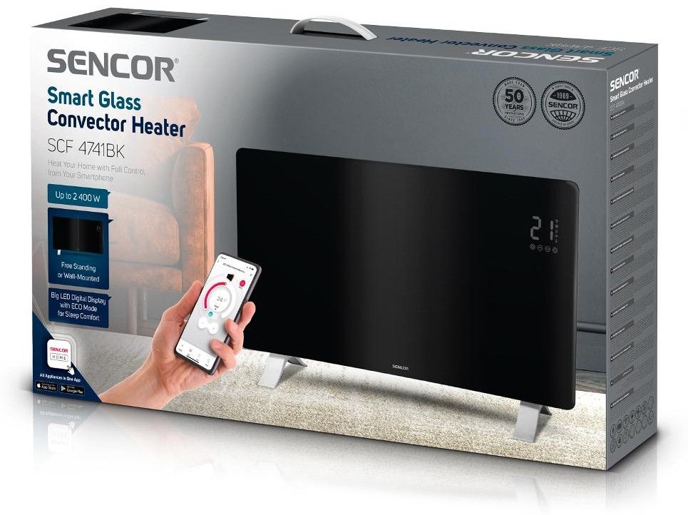 V aplikaci Sencor HOME můžete tento topný konvektor snadno a plně ovládat. Stačí vám připojení k Wi-Fi a chytrý telefon. Na dálku si lze nastavit hned několik funkcí a způsobů topení a výkonu. Jedním kliknutím konvektor vypnete i zapnete. V aplikaci také vidíte, zda je topný konvektor v provozu, a jaká je aktuální teplota v místnosti. Funkci časovače a podrobné týdenní nastavení v režimu 7/24 vám dovolí plánovat dopředu. Aplikaci si lze snadno stáhnout do mobilních přístrojů s QR kódem, který naleznete v návodu.
