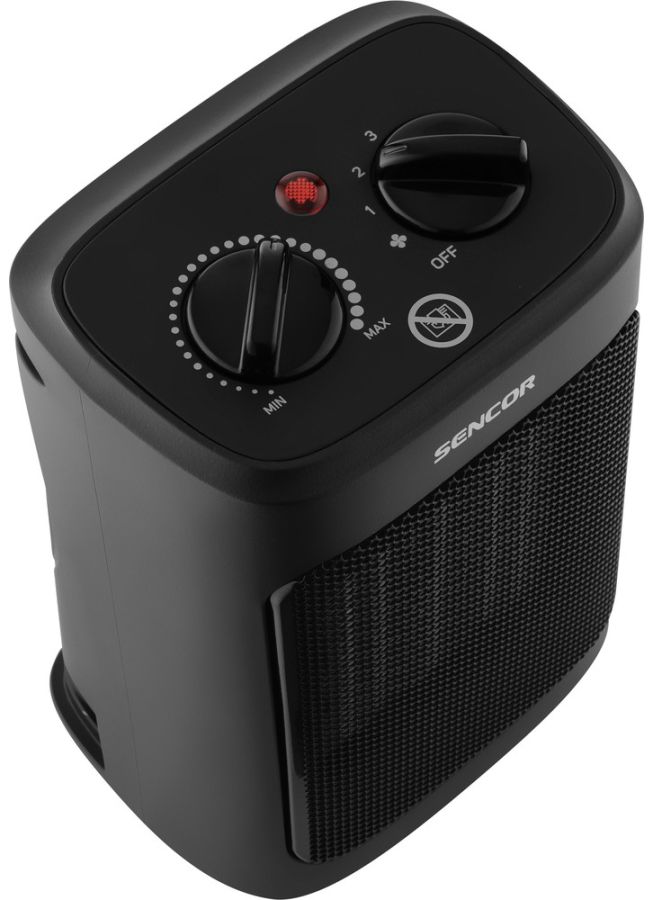 Keramické topidlo s dvojitou ochranou proti přehřátí, automatickým vypnutím při převrácení přístroje a 2 otočnými ovladači pro volbu funkce a nastavení teploty.
