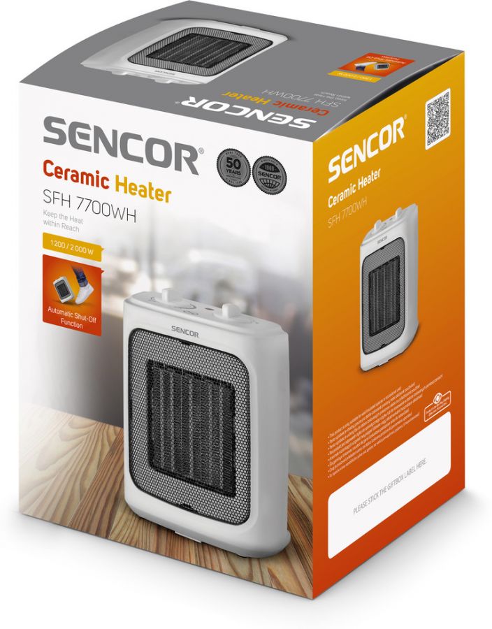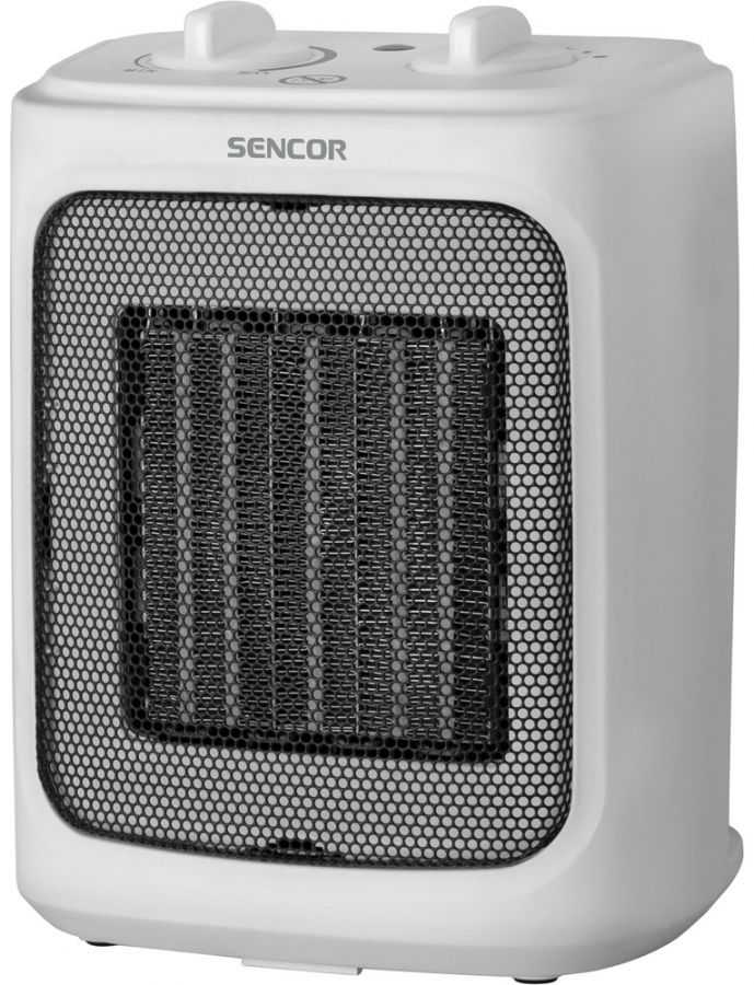 Keramické topidlo s dvojitou ochranou proti přehřátí, automatickým vypnutím při převrácení přístroje a 2 otočnými ovladači pro volbu funkce a nastavení teploty.