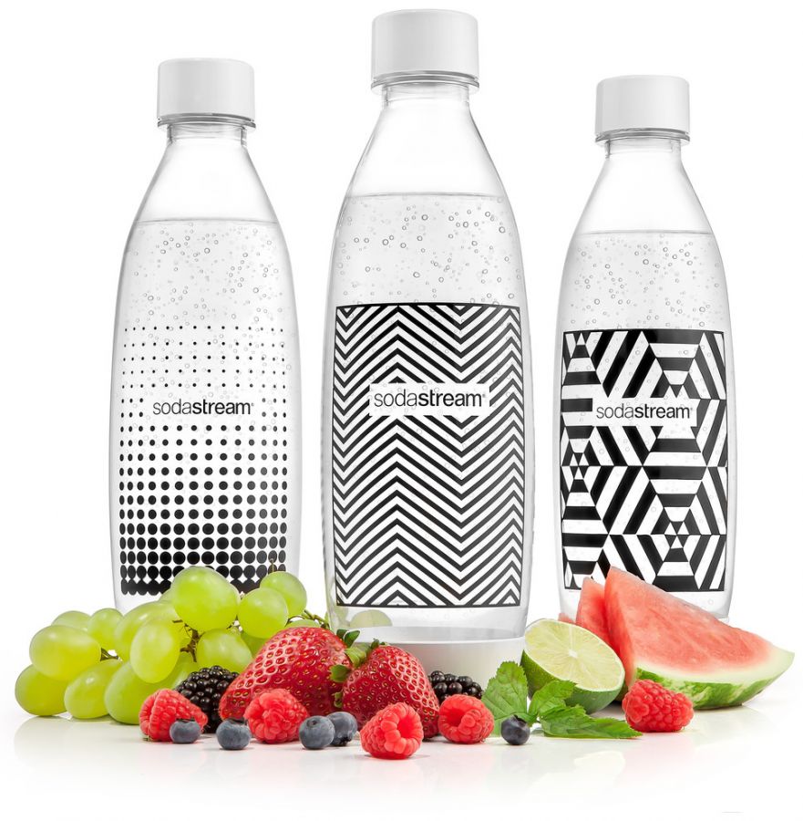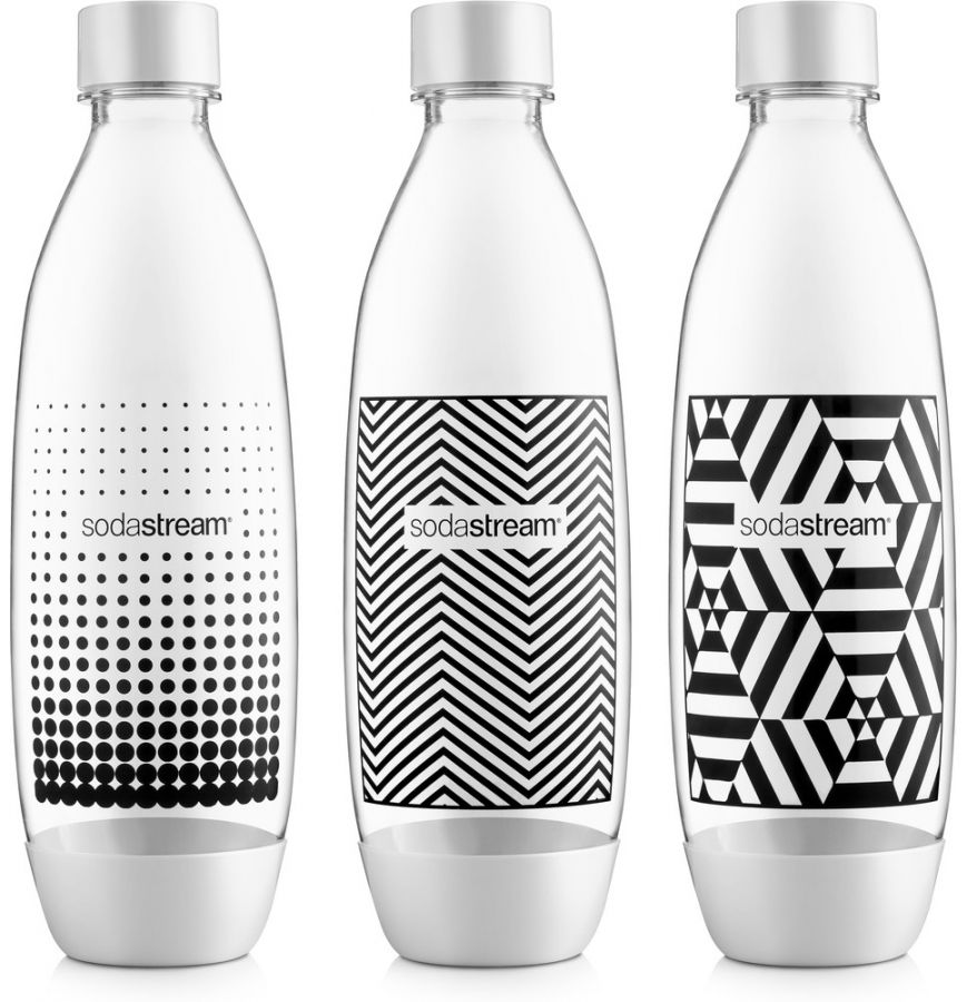 Sada 3 ks tlakových nápojových lahví pro výrobníky domácí perlivé vody SodaStream. Atraktivní design v jednoduché černobílé barvě potěší na jídelním stole rodinu i hosty. Domácí perlivá voda místo tahání nepraktických plastových lahví.