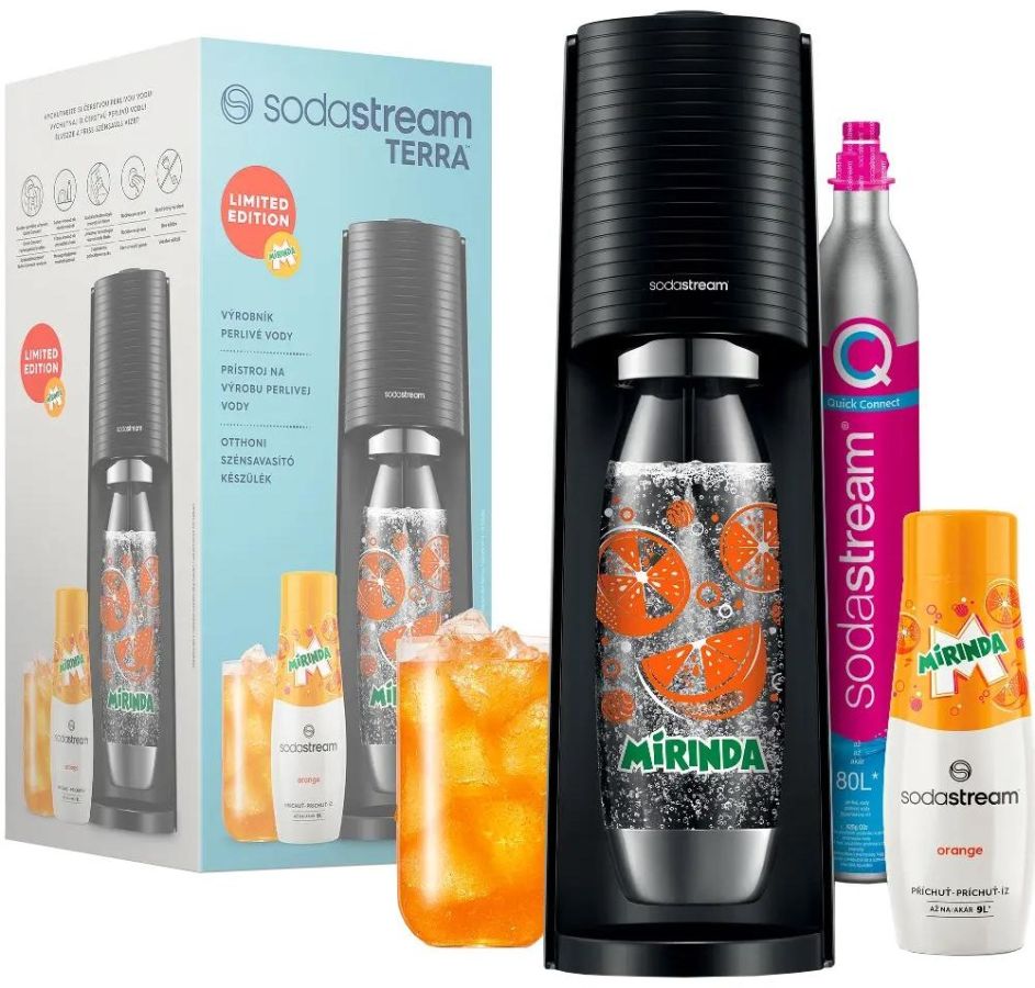 Limitovaná edice TERRA Black Mirinda Megapack – osvěžení s ikonickou příchutí! Hravý design, ikonická chuť a prémiové provedení! Výrobník perlivé vody SodaStream TERRA nyní přichází v limitované edici Mirinda, která přináší nejen osvěžující ovocnou chuť, ale také stylový vzhled. Elegantní černé provedení kombinuje matné a lesklé prvky, zatímco exkluzivní lahev se speciálním designem Mirinda poprvé obsahuje kovové prvky, které dodávají prémiový vzhled i vyšší odolnost. Navíc je sada zdarma doplněna o ikonickou příchuť MIRINDA o objemu 440 ml. Příchuť je připravena dle receptury v koncentrovaném stavu a po přidání do perlivé vody si připravíte nápoj, tak jak ho máte rádi. Váš oblíbený nápoj si nyní můžete kdykoliv připravit v pohodlí vašeho domova. Vystačí až na 9 litrů hotového nápoje. Lahve do výrobníku se vloží pouhým zacvaknutím. Nemusí se šroubovat.