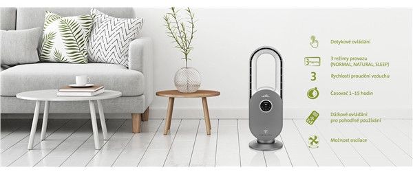 Výkonný ventilátor je moderní nejen svým designem, ale i funkcemi a provedením. Můžete si vybrat ze tří rychlostí foukání vzduchu, stejně jako ze tří režimů provozu, a to včetně režimu NATURAL, který připomíná proudění vzduchu v přírodě, či spánkového režimu se sníženou hlučností.