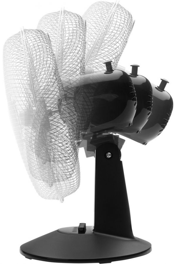 Stolní ventilátor o průměru 30 cm má 3 rychlosti a nastavitelný úhel sklonu.