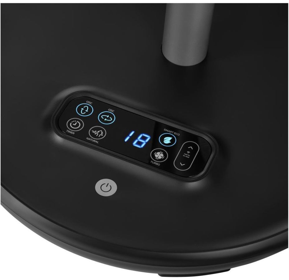 Ventilátor na svém displeji primárně ukazuje teplotu ve svém okolí. Kdykoli tak jedním pohledem zkontrolujete, je-li už čas jej zapnout. Buď přímo na ovládacím panelu umístěném na jeho podstavě, nebo dálkovým ovládáním.