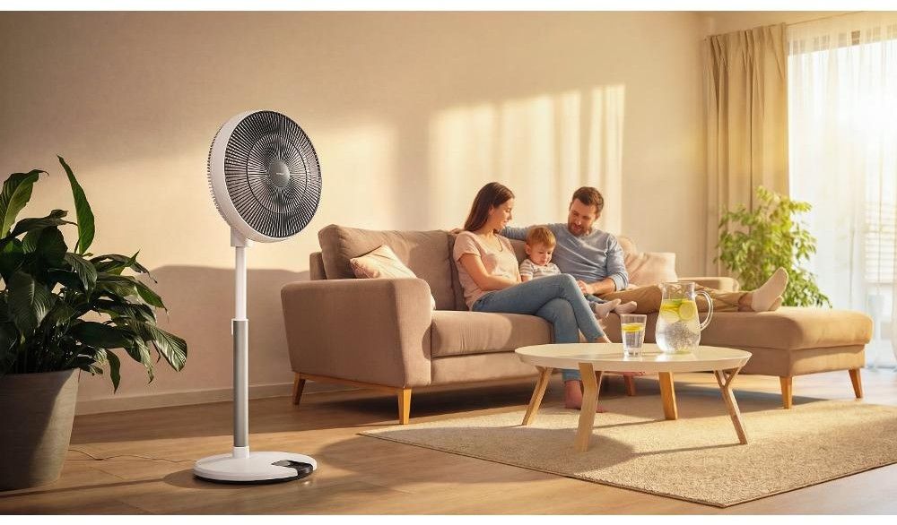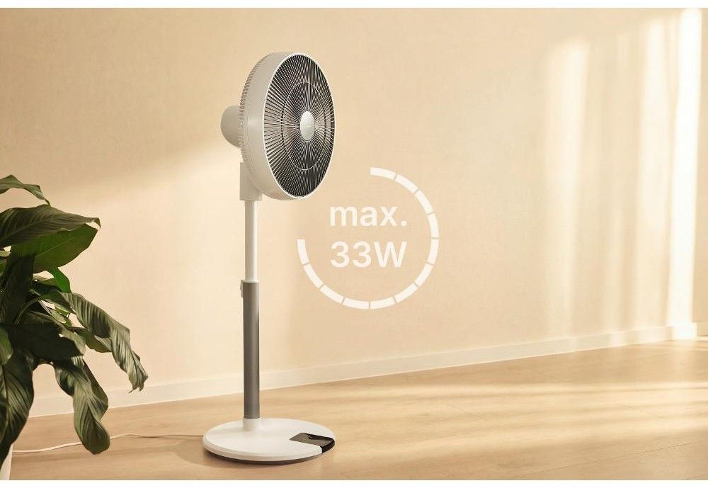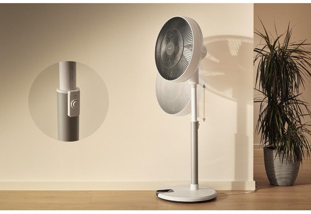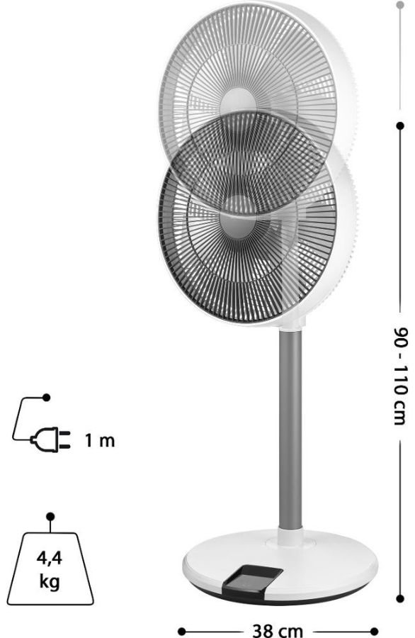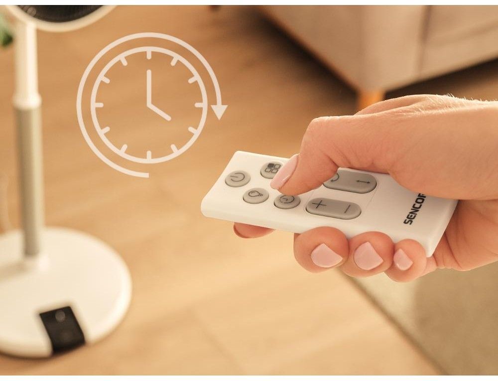 Stojanový ventilátor o průměru 36 cm má 12 úrovní rychlosti, nastavitelnou výšku, 4 provozní režimy, 8hodinový časovač a dálkové ovládání.