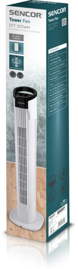 Sloupový ventilátor Sencor SFT 3112WH s výkonem 50 W vám dopřeje osvěžující vzduch v horkých letních dnech. Využívat můžete 3 rychlosti a stejné množství provozních režimů, které umožňují nastavení dle aktuálních potřeb. Komfortní ovládání zajistí dotykový panel nebo dálkové ovládání. Při používání vám přijde vhod i časovač nabízející automatické vypnutí v rozmezí 30 minut až 7,5 hodiny.