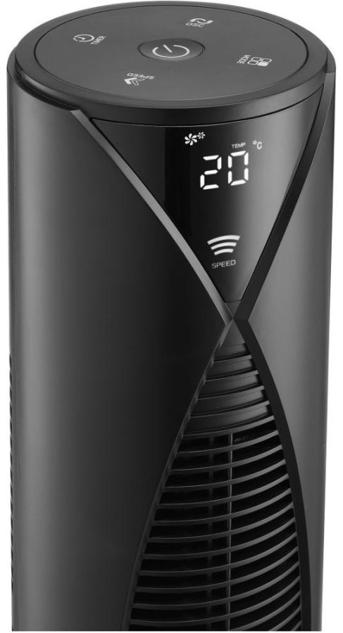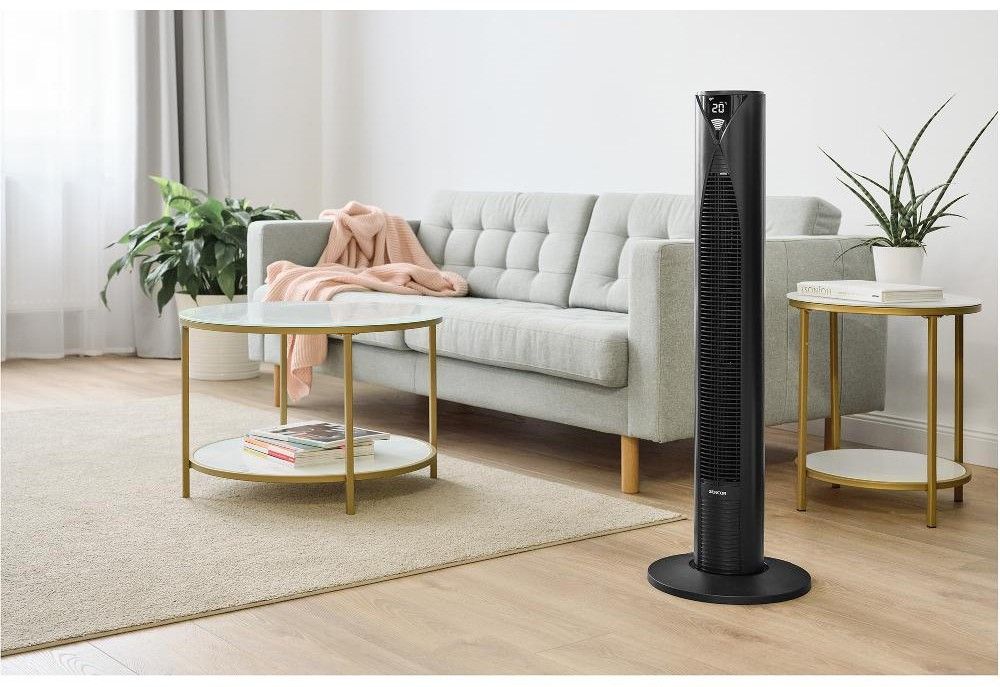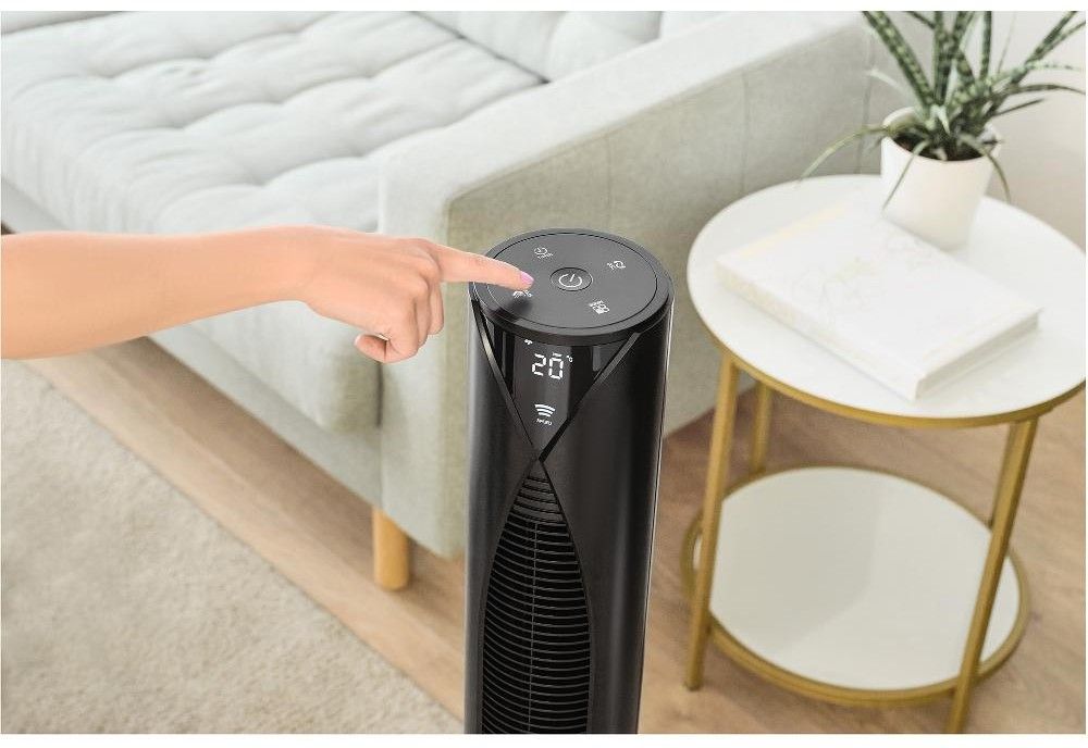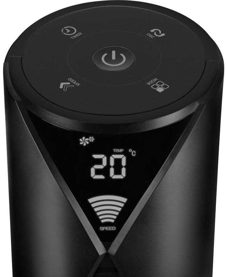 Sloupový ventilátor se 3-mi rychlostmi, 4-mi režimy, dotykovým panelem, časovačem a dálkovým ovládáním.