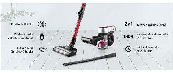 Tyčový, bezsáčkový vysavač 2v1 se 21,6 V Li-Ion akumulátorem pro pohodlné a bezdrátové vysávání. Vydrží vysávat až 25 minut.