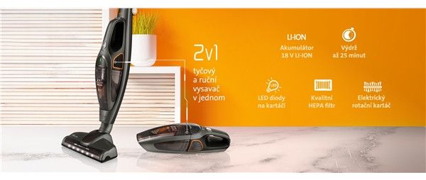 Tyčový, bezsáčkový vysavač 2v1 se 18 V akumulátorem pro pohodlné a bezdrátové vysávání. Vydrží vysávat až 25 minut.