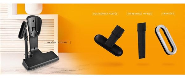 - Stojan s integrovaným nabíjecím adaptérem pro praktické uskladnění vysavače a příslušenství