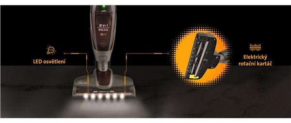 Hubice vysavače ETA Milio Li-ion je opatřena kontrolními LED diodami, které během vysávání osvětlují prostor přímo před vámi. Ve hře na schovávanou tak nad chuchvalci prachu v rozích či pod sedačkou vždy snadno zvítězíte.