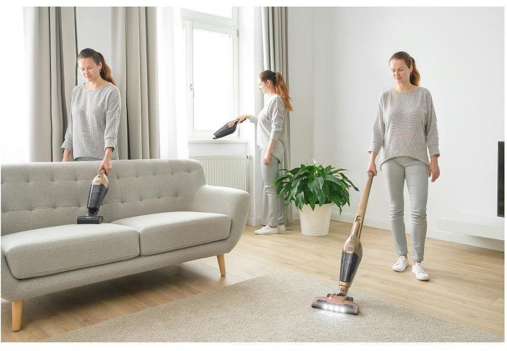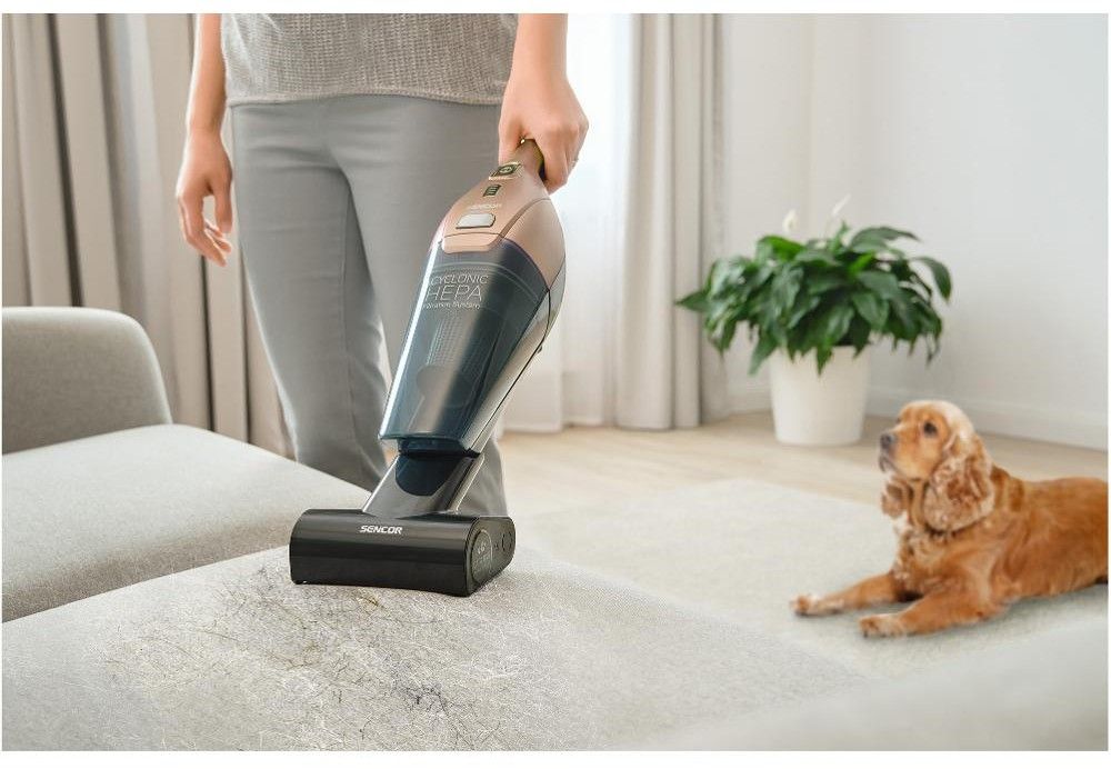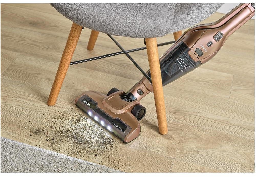 Tyčový vysavač Sencor SVC 0606GD 3 v 1 vysaje nečistoty z podlah, jako jsou parkety, dlaždičky, plovoucí podlahy nebo PVC, a dokonce i z hustých koberců. Rotační kartáč s nezávislým motorem zaručuje vynikající výsledky na jakémkoliv typu podlahy a zlepšuje efektivitu sání na kobercích s dlouhým vlasem.
