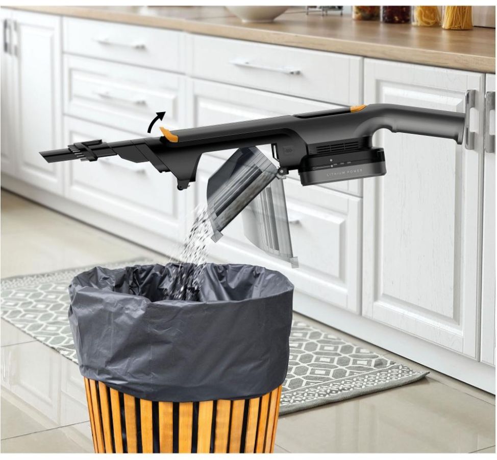Nádoba na prach se jednoduše otevře jediným pohybem ruky. Vysypávání nečistot je tak rychlé a hygienické.