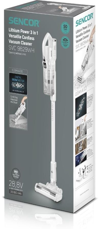 Kdo by si nepřál mít vždy po ruce účinného pomocníka na úklid domácnosti. Takovým je tyčový vysavač Sencor SVC 9829WH typu 3 v 1, který vás nikdy nezklame. Disponuje silným digitálním 550 W motorem díky němuž odstraňuje nečistoty v celé domácnosti vždy na jedničku. Lehké provedení v kombinaci s jednoduchým ovládáním nahrává tomu, že si poradí i s hůře dostupnými místy. Vysavač je vybavený vysokokapacitní baterií. Domácnost nebo kancelář si tak s jeho pomocí pohodlně vyčistíte na jedno nabití. Optimální výkon přístroje s ohledem na znečištění a typ povrchu zařizuje funkce AUTO. A pokud s vámi sdílí domov i domácí mazlíčci, jistě vás potěší motorizovaný kartáč Cat&Dog.