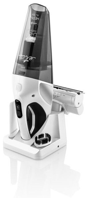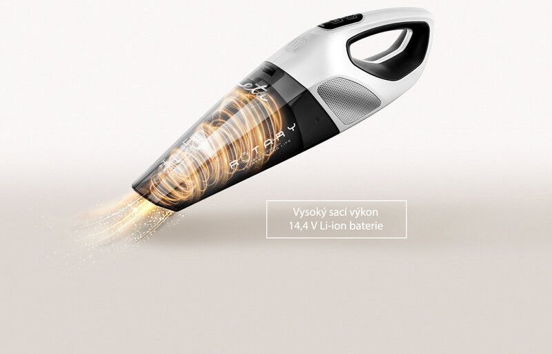Ruční, bezsáčkový vysavač s 14,4 V Li-ion akumulátorem, který na jedno nabití pracuje až 25 minut.