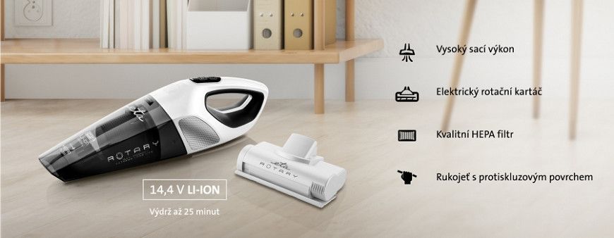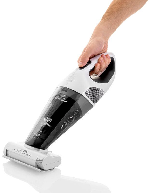 Ruční vysavač nové generace ETA Rotary vás nadchne silným sacím výkonem i elektrickým rotačním kartáčem, který zajistí ještě efektivnější sběr a vyčesání nečistot. O jejich filtraci se následně postará účinný HEPA filtr.