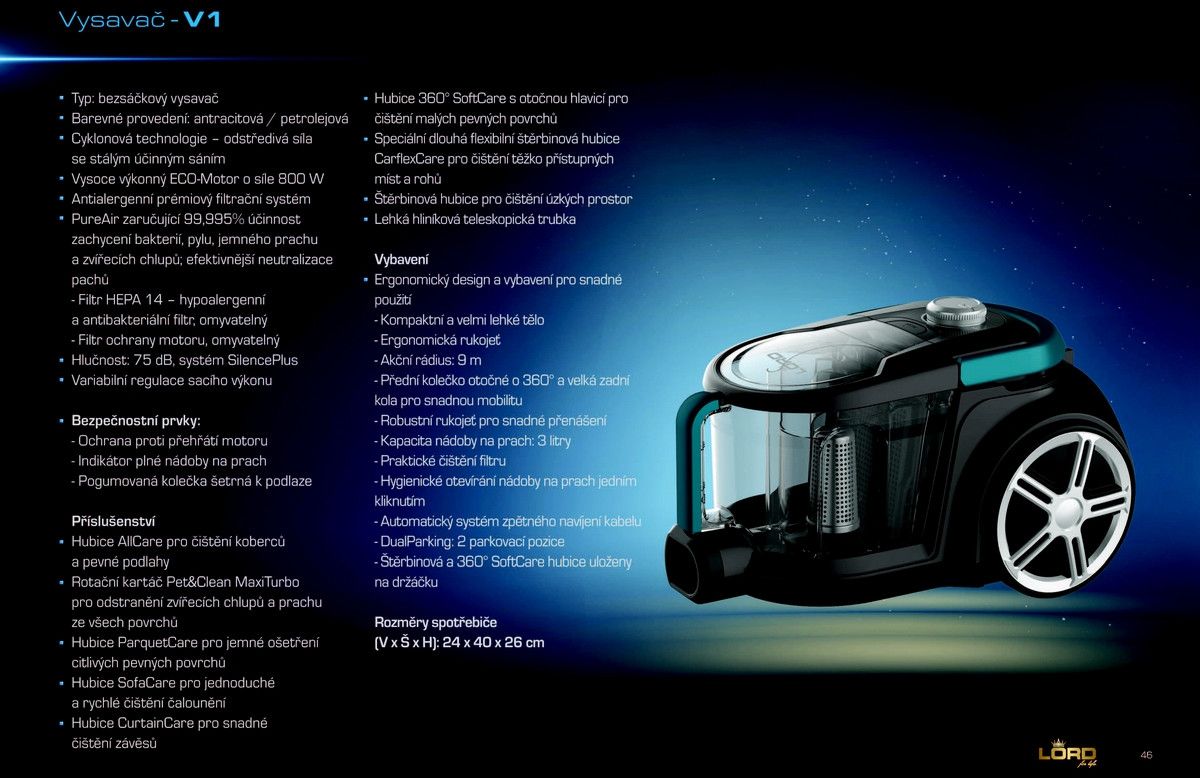 Příslušenství: Hubice AllCare pro čištění koberců a pevné podlahy, Rotační kartáč PetClean MaxiTurbo pro odstranění zvířecích chlupů a prachu ze všech povrchů, Hubice ParquetCare pro jemné ošetření citlivých pevných povrchů, Hubice SofaCare pro jednoduché a rychlé čištění čalounění, Hubice CurtainCare pro snadné čištění závěsů, Hubice 360° SoftCare s otočnou hlavicí pro čištění malých pevných povrchů, Speciální dlouhá flexibilní štěrbinová hubice CarflexCare pro čištění těžko přístupných míst a rohů, Štěrbinová hubice pro čištění úzkých prostor