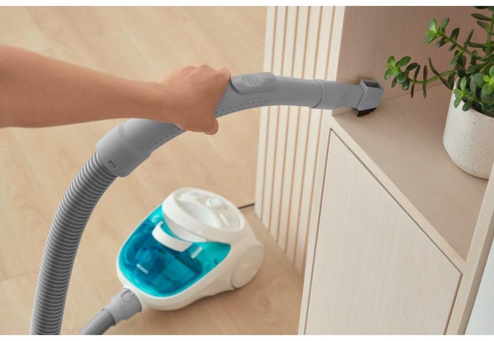 Pro maximální usnadnění úklidu je vybaven příslušenstvím, které vám pomůže se dostat i do hůře přístupných míst. Kombinovaná štěrbinová 2v1 a prachová hubice pak usnadní úklid prachu z různých koutů. Hubice na čalounění je vhodná pro textilní povrchy včetně matrací.