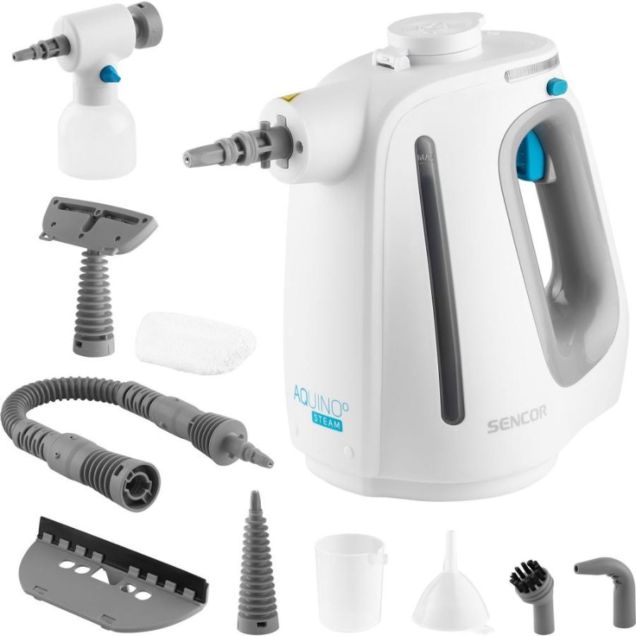 Obsah balení: parní čistič, nádoba na detergent, flexibilní prodlužovací hadice pro snadnou manipulaci, koncentrovací tryska na silně znečištěná místa, zahnutá tryska pro hůře dostupná místa, nylonový kulatý kartáč na nečistoty na malých plochách, stěrka na okna, rovné povrchy a obklady, nástavec s textilním návlekem na čalounění, trychtýř a odměrka pro doplňování vody