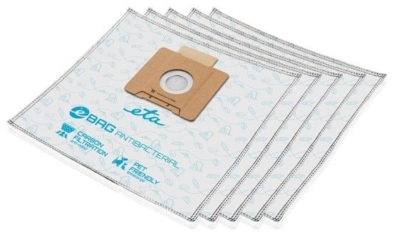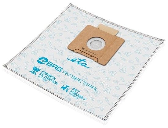 Součástí příslušenství je sáček ETA Antibacterial, který má speciální antibakteriální vrstvu eliminující růst bakterií a zamezující jejich šíření. Navíc obsahuje aktivní uhlí, které neutralizuje nepříjemné pachy. Má také vynikající účinnost filtrace i těch nejmenších prachových částic, vč. pylů, roztočů apod. Disponuje vysokou odolností proti nasáté vlhkosti a protržení tvrdými či ostrými předměty. Velmi účinnou filtraci zajišťuje kvalitní HEPA filtr č.12 se speciální vrstvou aktivního uhlí zachycující pachy. Signalizace vás včasně upozorní na plnost prachového sáčku a bezpečnostní pojistka varuje před chybějícím sáčkem.