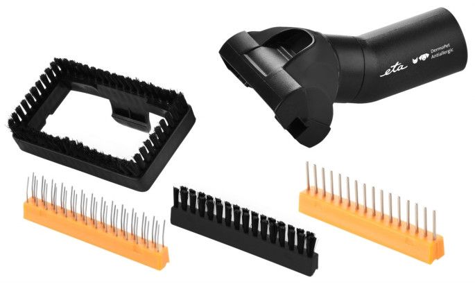 PŘÍSLUŠENSTVÍ SOUČÁSTÍ BALENÍ: Univerzální podlahová hubice (přepínání pro vysávání koberců nebo tvrdých podlah), Turbokartáč pro efektivnější vysávání koberců, účinně posbírá vlasy i zvířecí srst, Malý turbokartáč pro efektivnější vysávání čalouněného nábytku, Parketová hubice (vlákna z koňské žíně) na tvrdé podlahy (např. parkety, plovoucí podlaha, dlažba, lino), Speciální nástavec DermoPet pro ošetření kůže a srsti domácích mazlíčků; zbavuje zvířata nečistot, škodlivin a alergenů (např. prach, pyly, roztoče), Štěrbinová hubice / dlouhá štěrbinová hubice - je vhodná pro vysávání v úzkých a těžko přístupných místech (např. v žebrech radiátorů, za nábytkem atd.), Polštářová hubice - šetrně vysaje měkké textilní povrchy, jako je čalounění či polštáře, Kartáček s jemnými štětinkami pomáhá při úklidu na místech, která potřebujete šetrně zbavit prachu nebo pavučin (na nábytku, zdech či obrazech), Kovová teleskopická trubka (94 cm) - umožňuje ideální nastavení výšky pro uživatele, Prachový sáček (ETA ANTIBACTERIAL MAXI)