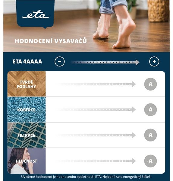 Hodnocení vysavačů ETA probíhá ve zkušebně v Hlinsku, kde jsou již více než 50 let podrobovány testům dle nejpřísnějších kritérií. Prochází zkouškami, které otestují jejich výkonnost při vysávání koberců a tvrdých podlah, stejně jako úroveň filtrace a hlučnost. Výsledné hodnocení tak vyjadřuje celkovou úroveň vysavače ETA. Ty, které uspěly na výbornou ve všech čtyřech kategoriích, nesou označení ETA 4AAAA. Uvedené hodnocení je hodnocením společnosti ETA. Nejedná se o energetický štítek.