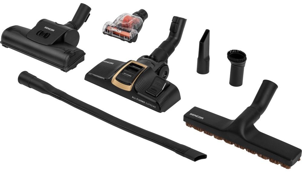 Dodávané příslušenství: univerzální podlahová hubice, turbo kartáč, mini turbo kartáč, hubice na tvrdé podlahy, dlouhá ohebná štěrbinová hubice, kartáčová hubice, štěrbinová hubice