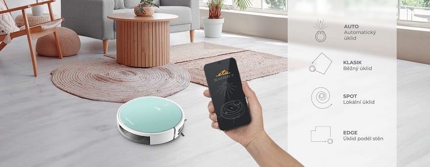 Díky chytré aplikaci rozdáte vysavači úkoly z gauče, koupelny nebo z práce. Chcete mít uklizeno pokaždé když přijdete domů? Úklid si můžete naplánovat klidně na konkrétní den a čas. Aplikace ETA SMART vám zkrátka umožní pohodlné ovládání vysavače odkudkoliv.