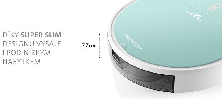 Robotický vysavač ETA Rover se u vás neztratí. Jeho 10 chytrých pohybových senzorů zajišťují optimální pohyb po místnosti a zabraňují pádu ze schodů. Se svým SUPER SLIM DESIGNEM a výškou pouhých 7,7 cm navíc vysaje i pod nižším nábytkem.