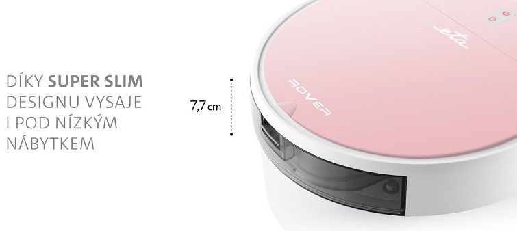 Robotický vysavač ETA Rover se u vás neztratí. Jeho 10 chytrých pohybových senzorů zajišťují optimální pohyb po místnosti a zabraňují pádu ze schodů. Se svým SUPER SLIM DESIGNEM a výškou pouhých 7,7 cm navíc vysaje i pod nižším nábytkem.