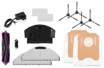 Bohaté příslušenství součástí balení: Nabíjecí stanice s odsávací jednotkou, 2x sáček pro odsávácí jednotku, 1x hlavní kartáč, 4x postranní kartáček, Nástavec na mopování, 2x mopovací textilie, 2x HEPA filtr, Nástroj na čištění