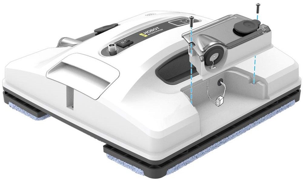 Velikost obsahu každého zásobníku je 26 ml, což vystačí na čištění plochy o rozměru 26 m2. Jako náplň používejte pouze destilovanou vodu nebo originální čisticí přípravek HOBOT. V případě, že je třeba vyměnit ultrazvukovou trysku, jednoduše vyměníte celý modul zásobníku na vodu uvolněním šroubku a robot bude opět fungovat jako nový.